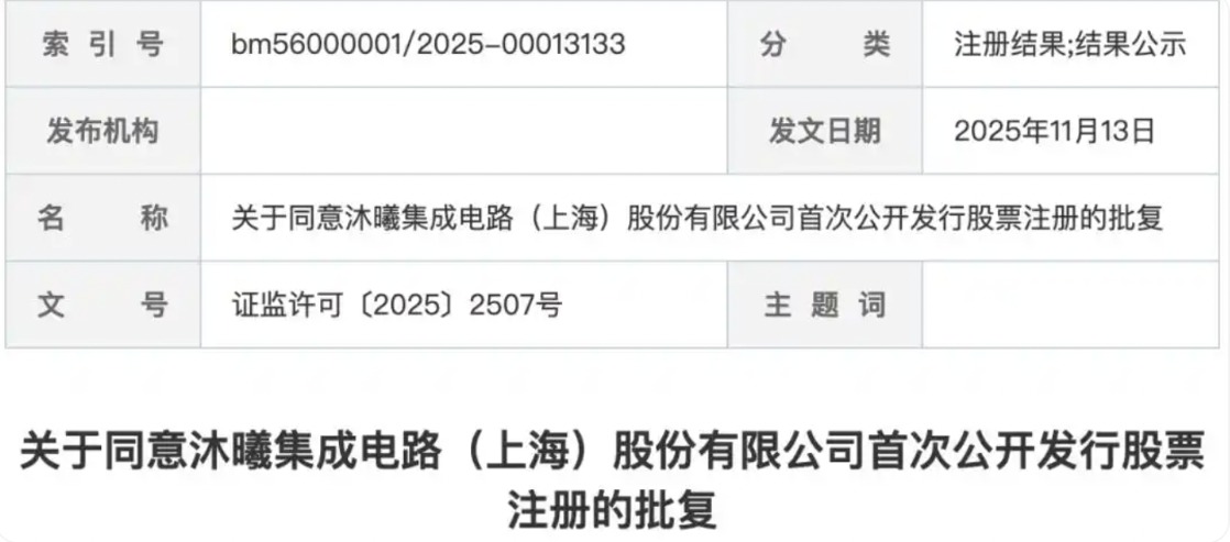 11月13日,证监会官网显示,11月12日,证监会已同意沐曦集成电路(上海)股份有限公司(以下简称:沐曦股份或沐曦)首次公开发行股票并于科创板上市的注册申请。